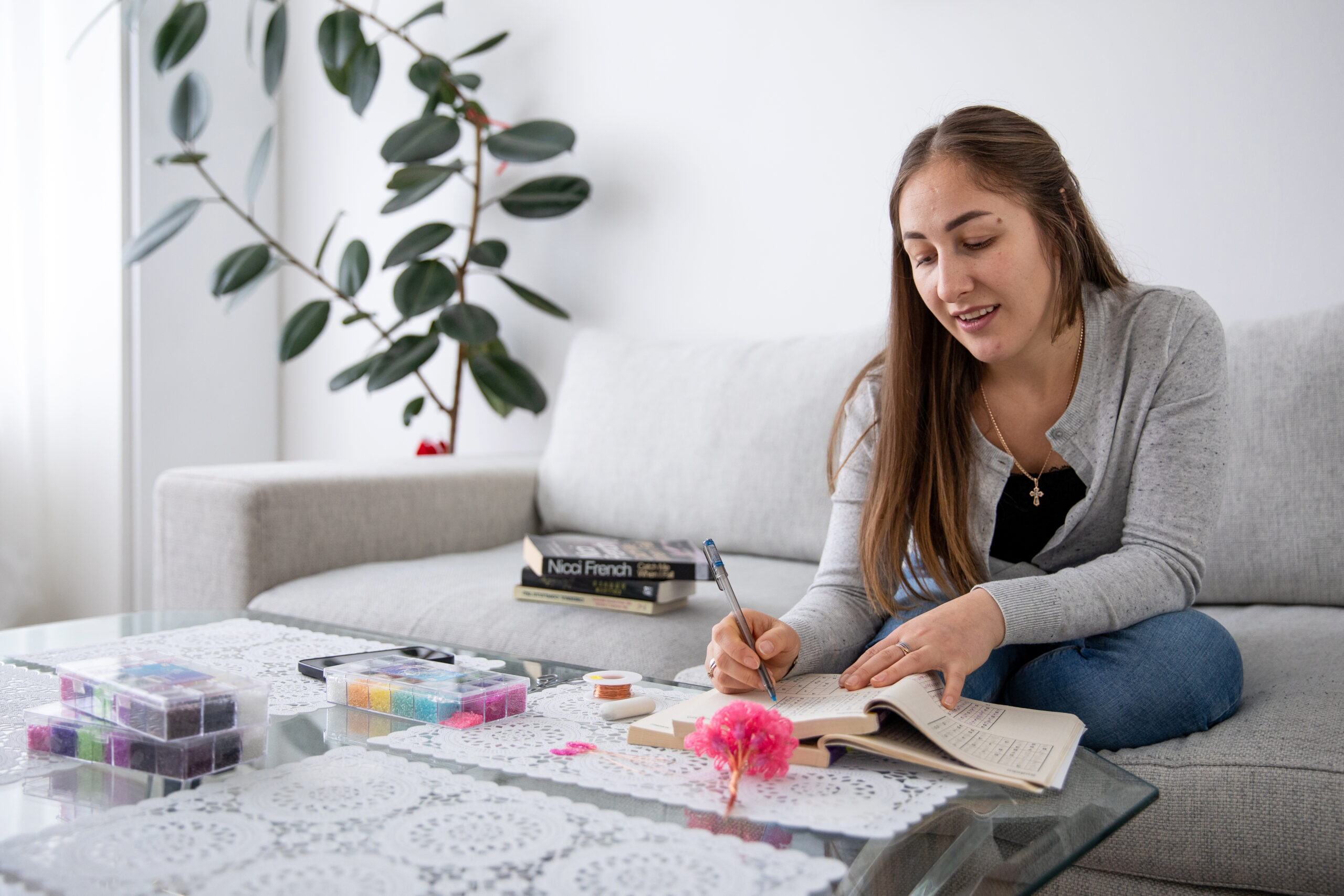 Op de tafel in de woonkamer staan vaak tal van bakjes met gekleurde kralen. ‘Ik maak graag mooie persoonlijke cadeautjes van bloemen en kralen. Dat is een heel intensief werk maar ik vind dat zo leuk om te doen. Die cadeautjes geef ik dan bij persoonlijke gebeurtenissen aan vrienden en familie. Daar kan ik enorm van genieten.’